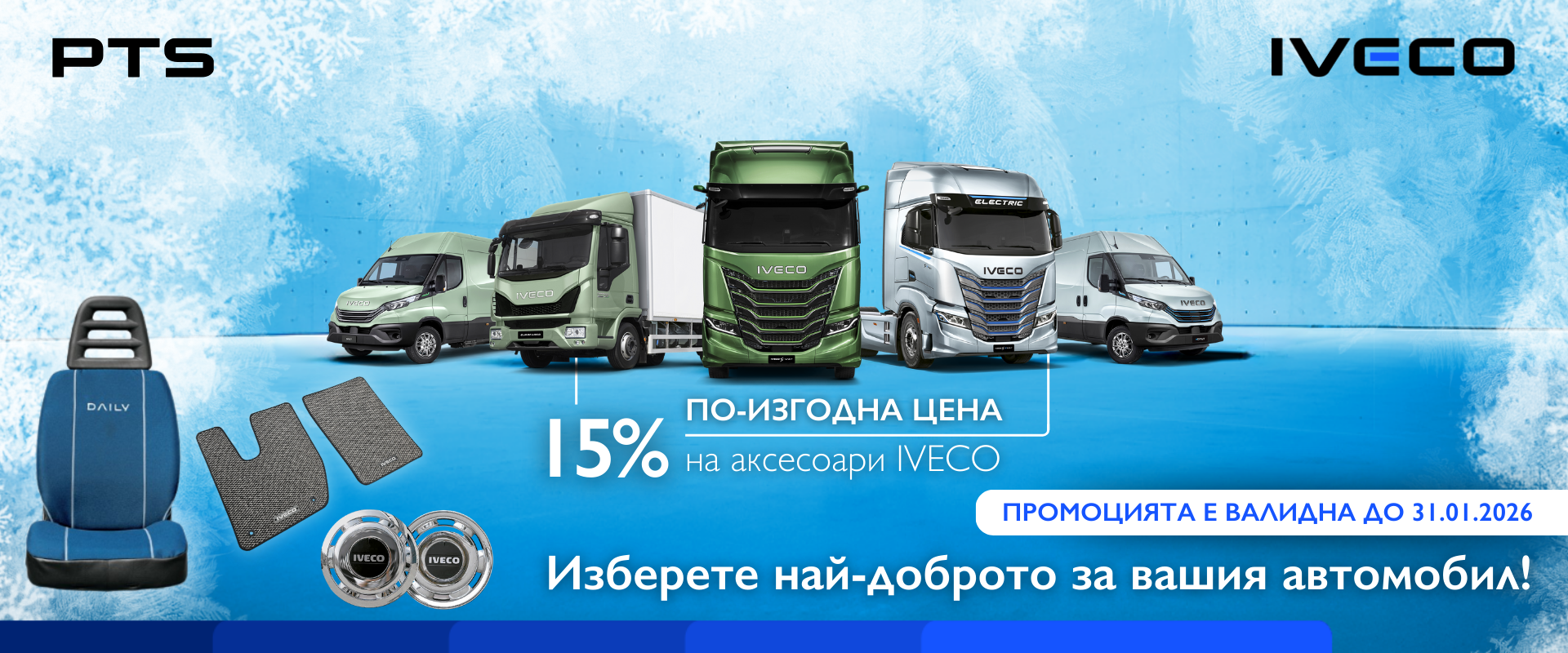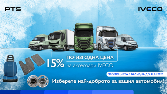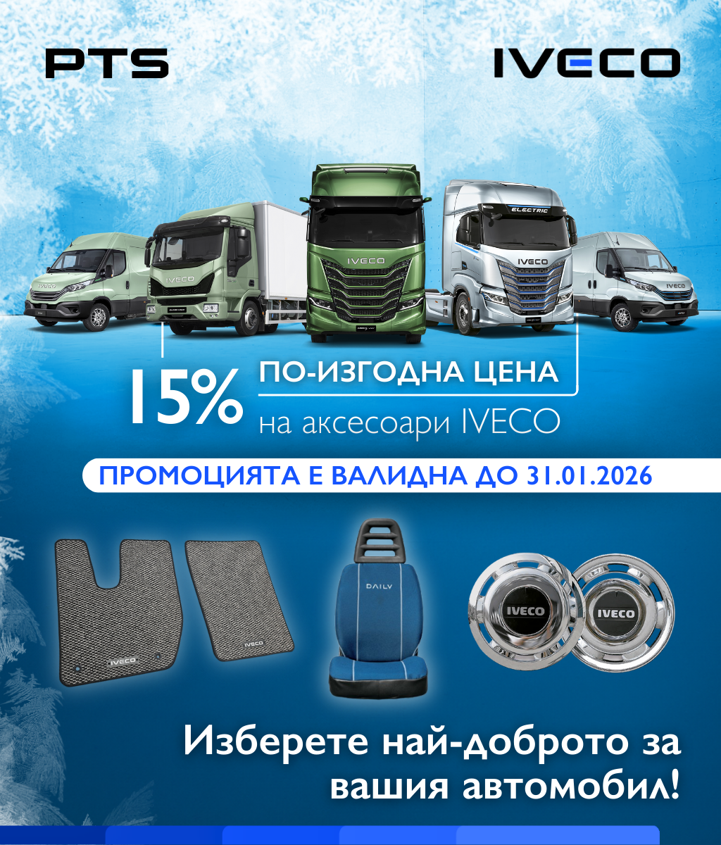 Офертата е валидна до 31.01.26 Обновете своето IVECO с 15% отстъпка за цялата гама оригинални аксесоари до 31.01.2026! Октрийте повече